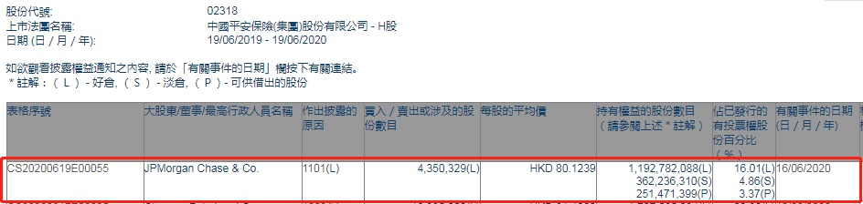 智通财经APP获悉,香港联交所最新资料显示,6月16日,摩根大通增持中国平安(02318)435.0329万股,每股作价80.1239港元,总金额约为3.49亿港元。增持后最新持股数目约为11.93亿股,最新持股比例为16.01%。