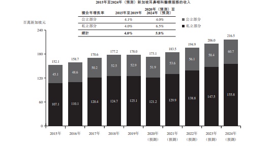 由于人口老龄化、医疗服务的可负担性提高以及新加坡居民追求更好的生活方式,按收入计算,新加坡耳鼻喉科医疗服务行业的市场规模,由2015年的约1.52亿新加坡元增长至2019年的约1 .78亿新加坡元,复合年增长率约为4.0%。2020年初新加坡爆发卫生事件已影响部分耳鼻喉科医疗服务的需求,由于社会隔离措施,部分原定的非紧急手术已推迟。展望未来,随着卫生事件结束后经济预期开始复苏、公众对健康和疾病预防的意识不断提高、用于治疗过往无法治愈的耳鼻喉疾病的技术发展及人口老年化程度加深,预期2020年到2024年新加坡耳鼻喉科医疗服务行业的市场规模按收益计将以约5.8%的复合年增长率增长。