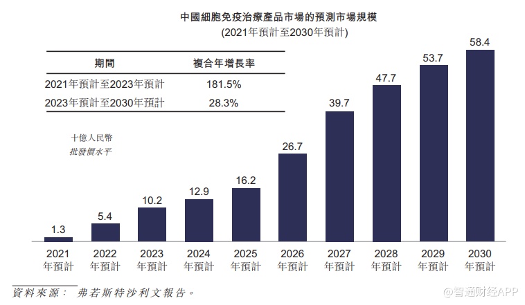 据弗若斯特沙利文数据显示,全球癌症免疫治疗市场规模将从2018年的206亿美元增至2023年的755亿美元,年复合增速近30%。而中国市场的免疫治疗产品规模发展则更为迅猛。从2021年至2023年,中国该市场的总规模将由13亿人民币增至100.2亿元,年复合增长率高达181.5%;从2023年至2030年,该市场规模将从100.2亿增至584亿,年复合增速28.3%。