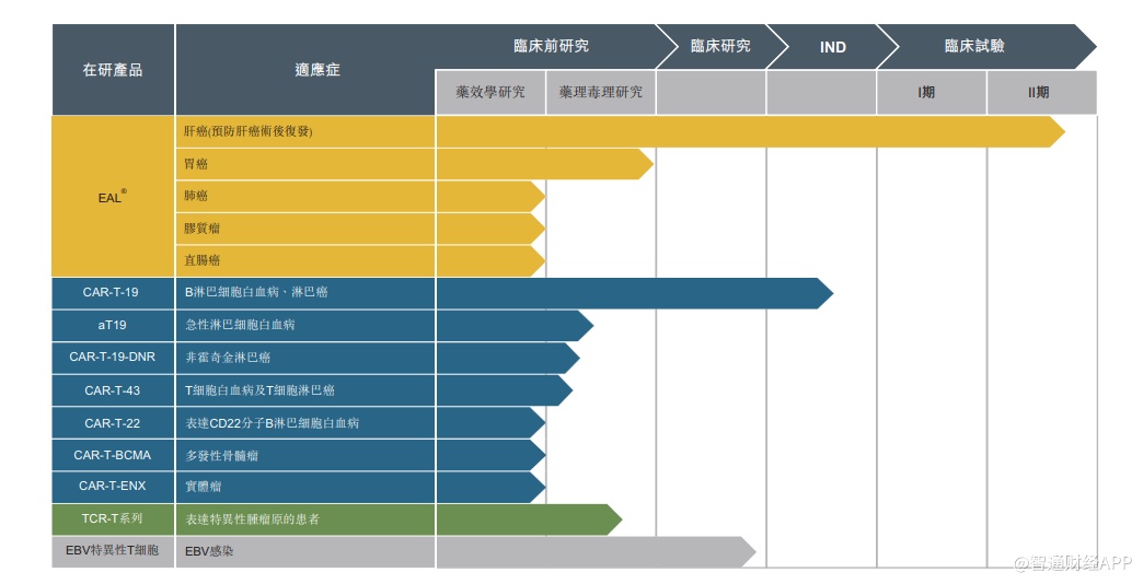 值得注意的是,EAL®细胞免疫治疗产品仅是永泰生物研发进度最快的药物之一,公司余下的在研产品高达9项,这其中包括了CAR-T细胞系列药物和TCR-T细胞系列药物等,适应症包括肝癌、白血病、淋巴癌、多发性骨髓瘤以及实体癌等。
