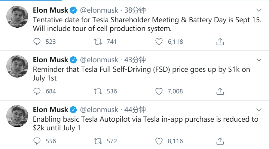 智通财经APP获悉,6月22日,特斯拉(TSLA.US)CEO马斯克在Twitter表示,暂定于美东时间9月15日召开特斯拉年度股东大会和电池日活动。他还表示,在美东时间7月1日前,在特斯拉的app内购买基本的自动驾驶功能的费用将降至2000美元。美东时间7月1日之后,特斯拉全自动驾驶汽车的价格将上涨1000美元。