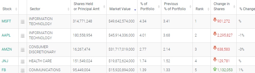 在前五大重仓股中,微软(MSFT.US)位列第一,持仓约3.15亿股,市值约为496亿美元,持股数较上季度基本持平。
