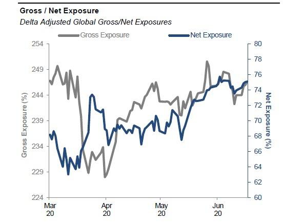 在6月21日,据高盛最新发布的每周风险敞口报告显示,对冲基金的恐慌性买入仍在继续,总杠杆率再次上升了4.4%至246.6%(第93个百分位),而净杠杆率再度上升了1.6%至75.1%,达到有史以来最高的第99个百分位。