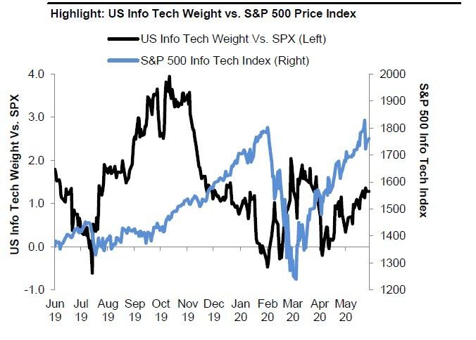 同样不足为奇的是,信息技术板块是净买入最多的板块,多头买入与卖空的比例为1:8:1。在该板块,软件和半导体板块出现净买入,而信息技术服务和通信设备板块出现净卖出。该板块相对于标准普尔500指数的权重上升了0.2个百分点至+1.5%(第64个百分位)。