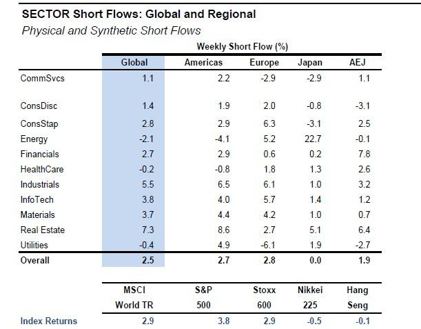 尽管看涨情绪总体持续高涨,但全球单只股票空头数增加了2.5%,其中欧洲、美洲和日本以外的亚洲地区领涨了空头流入。日本几乎没有出现净流入或净卖出现象。