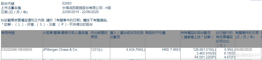 智通财经APP获悉,香港联交所最新资料显示,6月16日,摩根大通减持中海油田服务(02883)443.48万股,每股作价7.4663港元,总金额约为3311.15万港元。减持后最新持股数目约为1.27亿股,最新持股比例为6.99%。