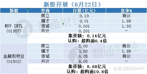 智通财经APP获悉,MBV INTL(01957)、金融街物业(01502)正在招股中,截至6月22日,辉立 、耀才、信诚等券商合计分别为其借出0.201亿港元、8.05亿港元。其中,金融街物业超购逾10.8倍。