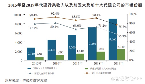 中指院研究报告显示,近几年代建行业尽管发展急速,但整体规模仍相对较小。自2015年至2019年,代建行业的收入及净利润增长迅速,复合年增长率分别为34.9%及37.8%。尽管发展急速,代建行业的整体规模仍相对较小。于2019年,主要代建公司的收入达91亿元,产生净利润23亿元。并且前十大代建公司占据了约75.7%的市场份额,行业高度集中,而绿城所占市场份额和规模均有保证,在手项目资源较为丰富,增长后劲依然较为充足。