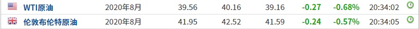 截至发稿,WTI原油跌0.83%,报39.50美元/桶。布伦特原油跌0.66%,报41.91美元/桶。