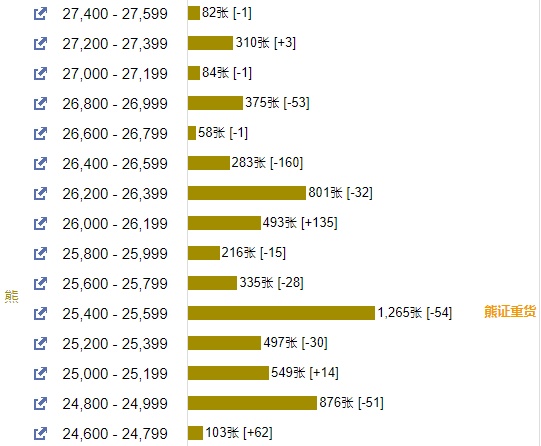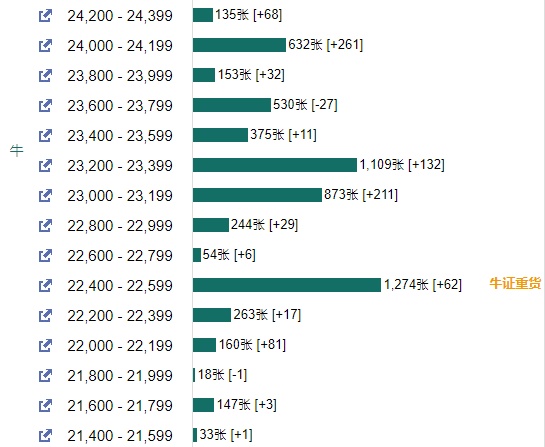 智通财经APP获悉,截至6月22日,恒指最新的牛熊街货比例48:52。摩根恒指牛熊证街货分布图中的数据显示,熊证街货重货区在25400-25599区间,该区间最新熊证数量为1265张,较上一交易日减少54张,最多新增区间在26000-26199区间,该区间最新熊证数量为493张,新增135张。牛证街货重货区在22400-22599区间,该区间最新牛证数量为1274张,较上一交易日增加62张,最多新增区间在24000-24199区间,该区间最新牛证数量为632张,新增261张。