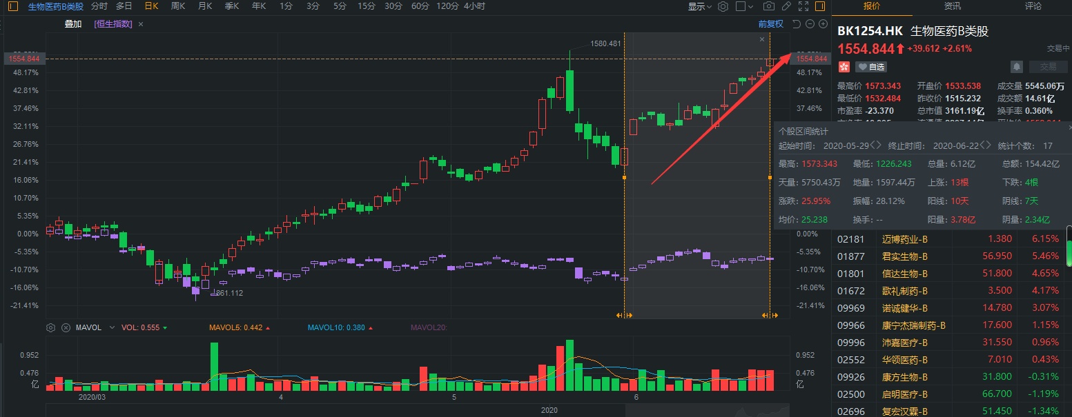 6月的港股显然是医药板块的天下,尤其是“B”字头的未盈利生物科技股们,无论是器械代表启明医疗-B(02500),或是大分子药物代表复宏汉霖-B(02696)、小分子的亚盛医药-B(06855),放眼望去均实现了30%以上的涨幅,甩恒指一大截。
