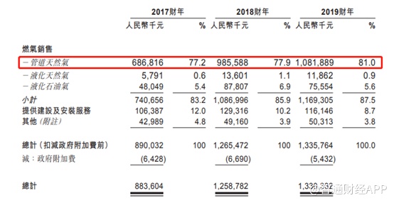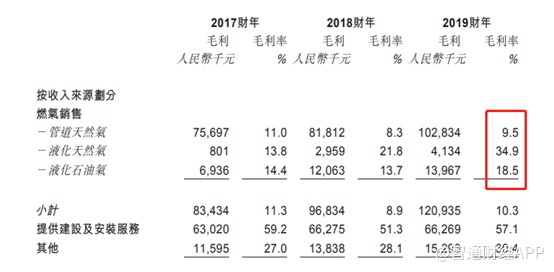 从业绩看,2017年至2019年,其销售收入达到8.8亿元、12.6亿元和13.3亿元,年复合增长22.9%,不过也可以看到2019年收入增速明显放缓。收入结构看,2019年,燃气销售收入占比87.5%,同比增加1.6个百分点,其中管道天然气销售收入占比达到81%,同比增加3.1个百分点。不过其收入占比增加,除了自身收入增加之外,主要是因为设备安装和服务的收入减少所致,智通财经APP发现,2019年相关的项目有所减少。