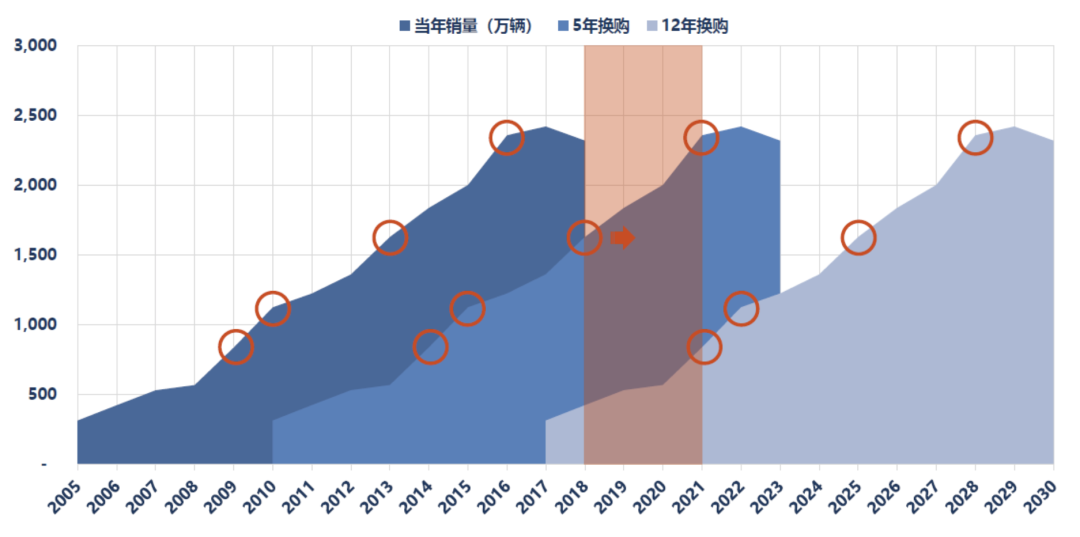 狭义乘用车当年销量、5年换购量、12年换购量(万辆)