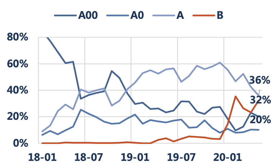 注:A00级占比较小,波动较大,因此在此图中剔除A00级
