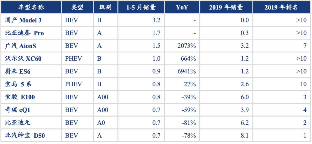 今年新能源车高端化趋势非常显著。2020年1-5月新能源乘用车销量前十排名中,前五名中有4款2019年下半年上市的新车,特斯拉国产Model 3获得车型销量冠军。2019年全年畅销的北汽绅宝D50、比亚迪元、奇瑞eQ1和宝骏E100排名下滑至7-10名,而销量前六中有4款B级车型。中低端车型的目标消费者对价格较为敏感,公共卫生事件对经济的影响一定程度压制他们的消费需求。中高端车型的目标消费者对价格敏感程度相对较低,更加注重车型品牌力。特斯拉国产化Model 3的热销带动了中高端新能源汽车的热度和销量。