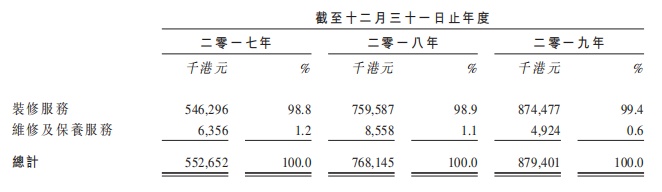 2017-2019年,德合集团收益分别约为5.53亿港元、7.68亿港元及8.79亿港元,当中装修服务分别占总收益约98.8%、98.9%及99.4%,余下收益来自提供维修及保养服务,分别占总收益约1.2%、1.1%及0.6%。