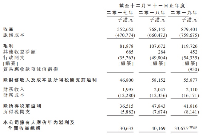 此期间,毛利总额分别为约8187.8万港元、1.08亿港元及1.20亿港元,其中装修服务的毛利率分别为约14.6%、13.8%及13.5%,维修及保养服务的毛利率分别为约36.9%、31.0%及38.6%。