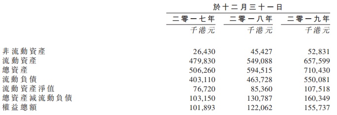 2017-2019年,流动资产净值分别为约7672万港元、8536万港元及1.08亿港元。流动资产净值增加主要由于往绩期间的业务增长及盈利业务使流动资产增加,且被流动负债增加部分抵销。