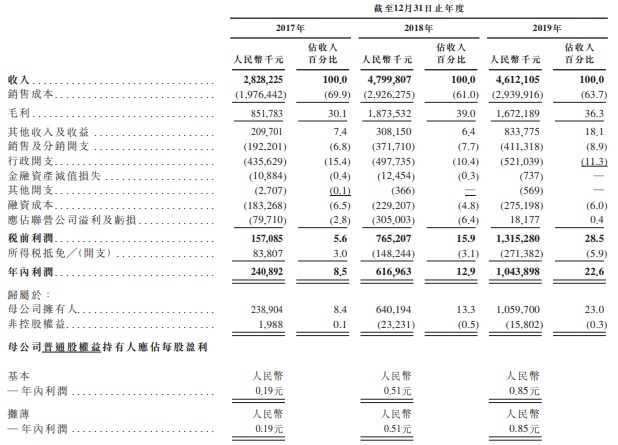 截至2017年、2018年及2019年12月31日止年度,该企业的毛利分别为人民币8.52亿元、人民币18.74亿元及人民币16.72亿元,及该企业的毛利率分别为30.1%、39.0% 及36.3%。