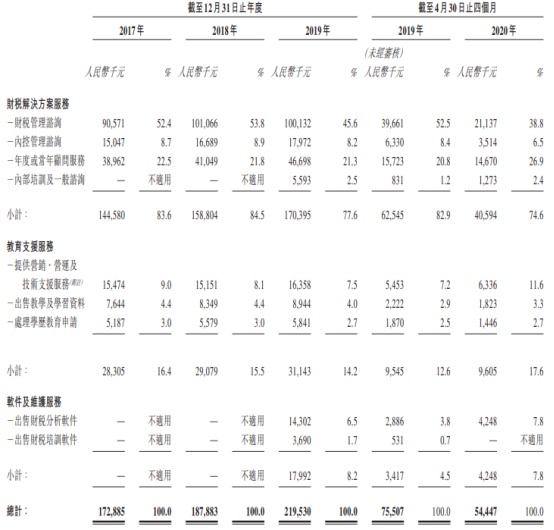 公司的主要营收来自财税解决方案服务,截至2017年、2018年及2019年12月31日止年度以及截至2020年4月30日止四个月,该业务占总收入的83.6%、84.5%、77.6%和74.6%。