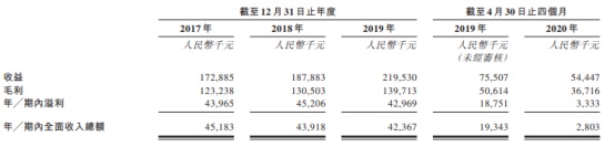 于往绩记录期间,公司截至2017年、2018年及2019年12月31日止年度及截至2020年4月30日止四个月之收益分别约为人民币1.73亿元、人民币1.88亿元、人民币2.20亿元及人民币5445万元。