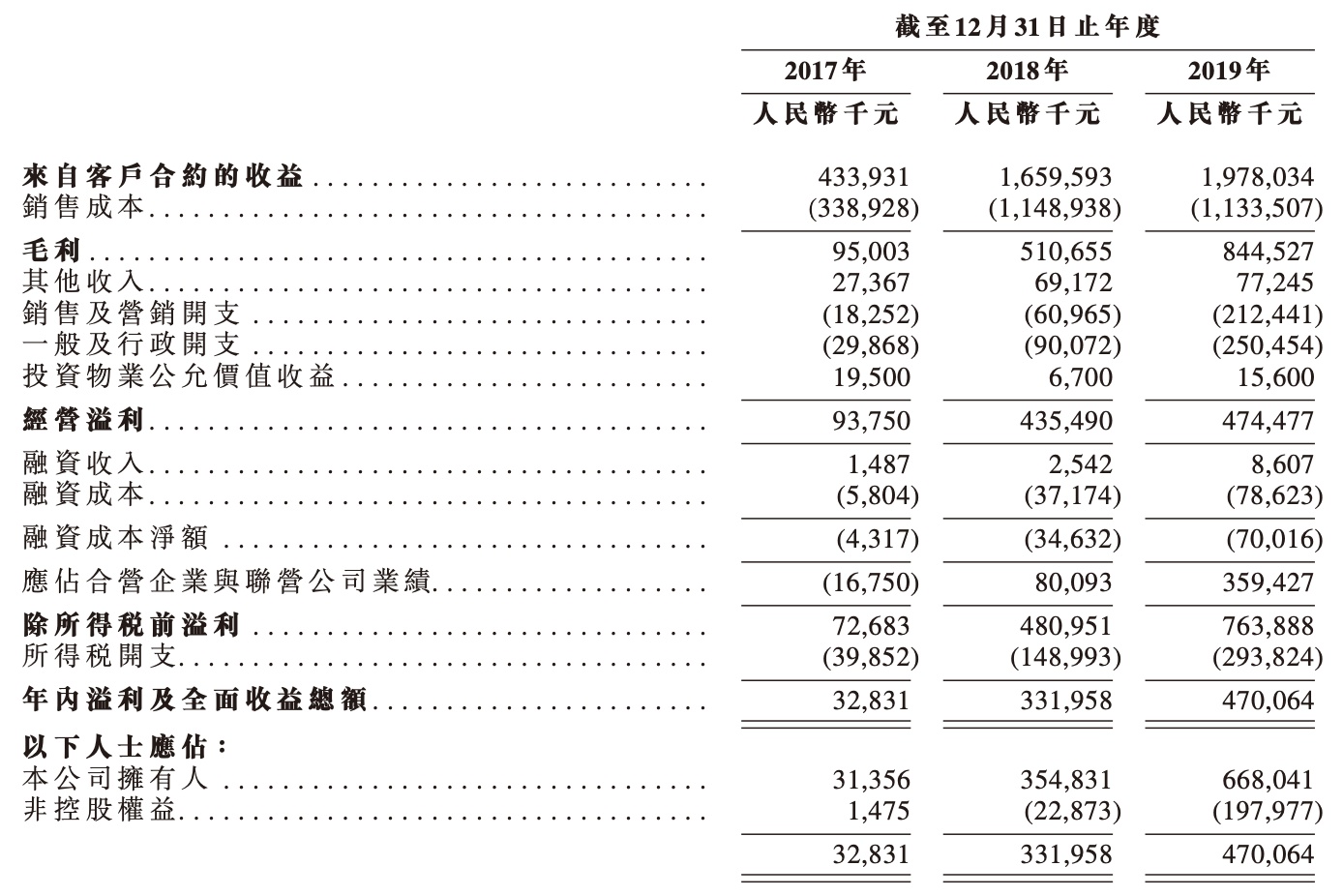 于往绩记录期间,其收益来自四个城市的9个开发项目的物业开发及销售。截至2019年12月31日止三个年度,物业开发及销售收益分别为人民币4.339亿元、人民币16.60亿元及人民币19.78亿元,复合年增长率为113.5%;净利润分别为人民币3283.1万元、人民币3.32亿元及人民币4.70亿元,复合年增长率为278.6%。