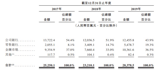 大部分营业收入来自于公司银行业务。该银行向公司银行客户提供全面的金融产品及服务,包括公司贷款(包括票据贴现)、公司存款、交易银行服务、投资银行服务以及其他手续费及佣金类产品及服务。截至2017年、2018年及2019年12月 31日止年度,该银行来自公司银行业务的营业收入分别为人民币137.22亿元、人民币120.37亿元及人民币124.56亿元,分别占该银行同期营业收入总额的54.4%、 51.9%及43.9%。