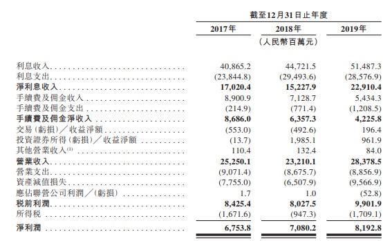 营业收入由2017年的人民币252.5亿元下降8.1%至2018年的人民币232.1亿元,随后增加22.3%至2019年的人民币283.79亿元。除了净利息收入以及手续费及佣金净收入变动的影响外,营业收入亦受到投资证券所得(亏损)╱收益净额变动的影响,该等变动于2018年主要因该银行采纳《国际财务报告准则》第9号而有所变化,而于2019年由于该银行特殊目的载体投资规模的缩减而有所减少。