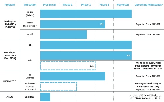 两款孤儿药其中之一为治疗家族性高胆固醇血症(HoFH)的口服剂洛美他派(lomitapide),商品名为JUXTAPID;另一个则是治疗全身脂肪代谢障碍的注射用美曲普汀 (metreleptin),商品名为MYALEPT。这两款孤儿药均已在全球市场上销售超过六年。