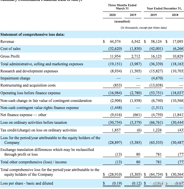 根据Amryt Pharma招股说明书披露,2019年公司营收5812万美元,同比增长2.4倍;研发费用为1583万美元,同比增长47.9%;归属于公司股东的综合亏损额为6475万美元,同比扩大1.1倍;基本和摊薄后每股亏损0.86美元,2018年同期亏损0.67美元。