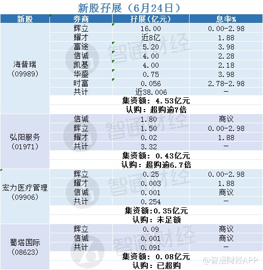 智通财经APP获悉,海普瑞(09989) 、弘阳服务(01971)、宏力医疗管理(09906)、蜀塔国际(08623)正在招股中,截至6月24日,辉立 、耀才、信诚等券商合计分别为其借出38.006亿港元、3.32亿港元、0.254亿港元、0.091亿港元。其中,海普瑞超购逾7倍,弘阳服务超购逾6.7倍。