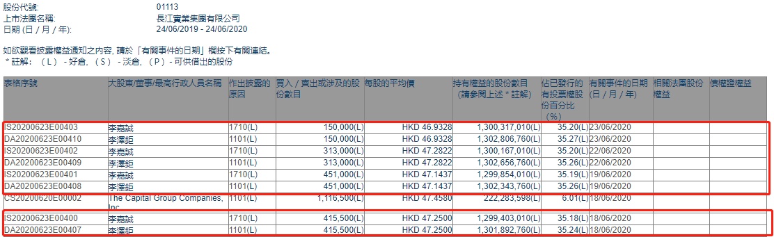 智通财经APP获悉,香港联交所最新资料显示,6月18日至23日,李嘉诚父子连续增持长实(01113)132.95万股,总金额约为6273万港元。智通财经APP获悉,增持后李嘉诚最新持股数目约为13亿股,最新持股比例约为35.2%;李泽楷最新持股数目约为13.03亿股,最新持股比例约为35.27%。