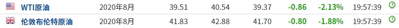 截至发稿,WTI原油跌2.13%,报39.51美元/桶。布伦特原油跌1.88%,报41.83美元/桶。