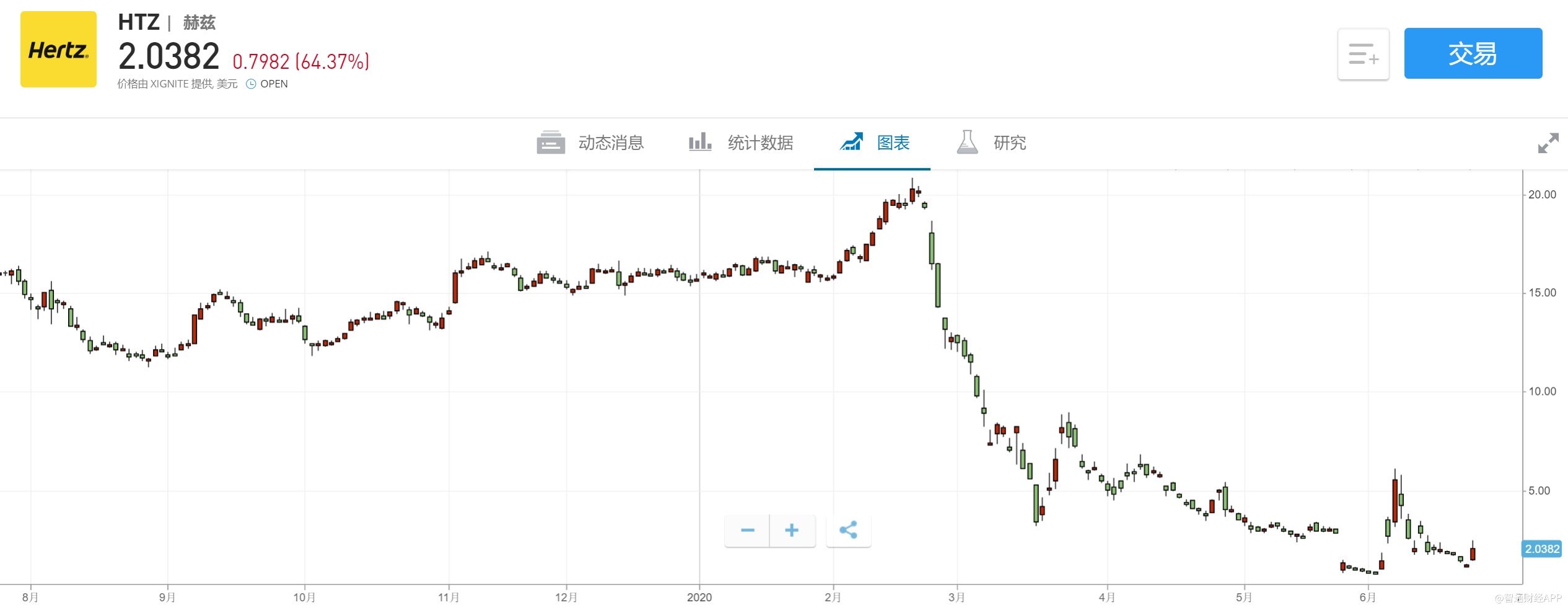 智通财经APP获悉,周三美股盘初,赫兹(HTZ.US)股价拉涨,成交量超过1.77亿。截至北京时间23:31,该股涨64.37%,报2.0382美元。