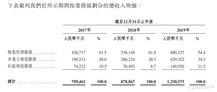 按业务划分,公司物业管理服务2017年、2018年、2019年收入分别为4.36亿元、5.36亿元、6.8亿元,占总收入的61.5%、61%及54.4%;非业主增值服务2017年、2018年、2019年收入分别为1.98亿元、2.66亿元、4.29亿元,占总收入的28%、30.3%及34.3%;社区增值服务2017年、2018年、2019年收入分别为7423万元、7649万元、1.4亿元,占总收入的10.5%、8.7%、11.3%。