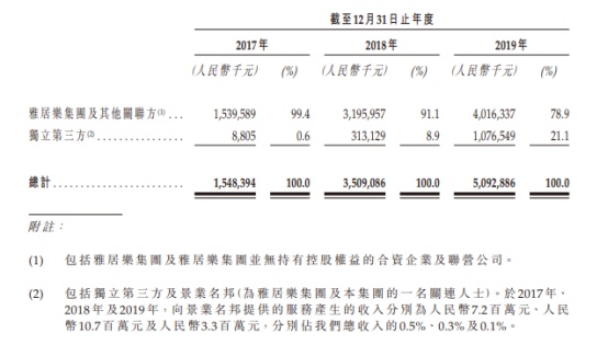 从上表可以看出,雅居乐集团及其他关联方分别贡献该公司2017年、2018年及2019年总收入的99.4%、91.1%及78.9%,而第三方分别贡献2017年、2018年及2019年总收入的0.6%、8.9%及21.1%。
