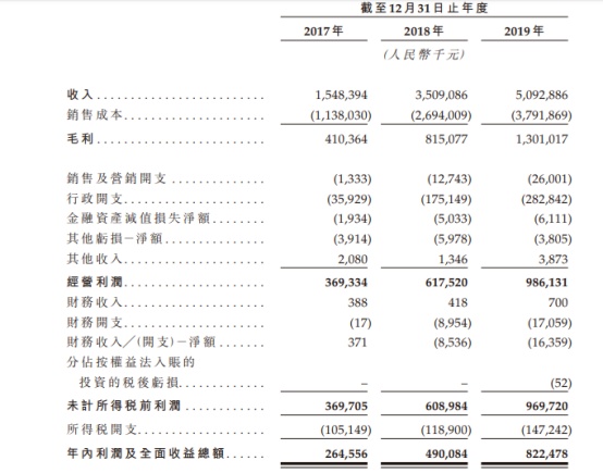 该公司收入从2017年的人民币15.484亿元增加至2018年的人民币35.091亿元,并进一步增至2019年的人民币50.929亿元,年复合增长率为81.4%;纯利由2017年的人民币2.646亿元增加至2018年的人民币4.901亿元,并进一步增至2019年的人民币8.225亿元,年复合增长率为76.3%。
