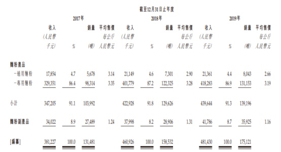 截至2017年、2018年及2019年12月31日止年度,该公司收入分别为3.81亿元人民币、4.61亿元人民币和4.81亿元人民币,持续增长主要受专用面粉的销售所推动,分别占总收入约86.4%、87.2%及86.9%,并由截至2017年12月31日止年度约人民币3.294亿元增加至截至2019年12月31日止年度约人民币4.183亿元。