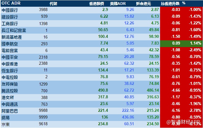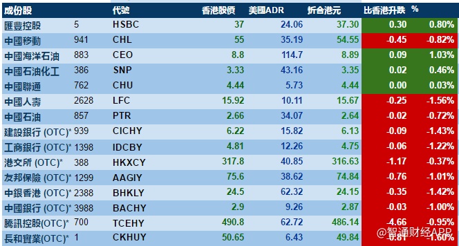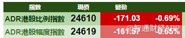 智通财经APP获悉,美股全线上涨,但港股ADR指数全日偏软,按比例计算,收报24,610点,较港周三收市跌171点。