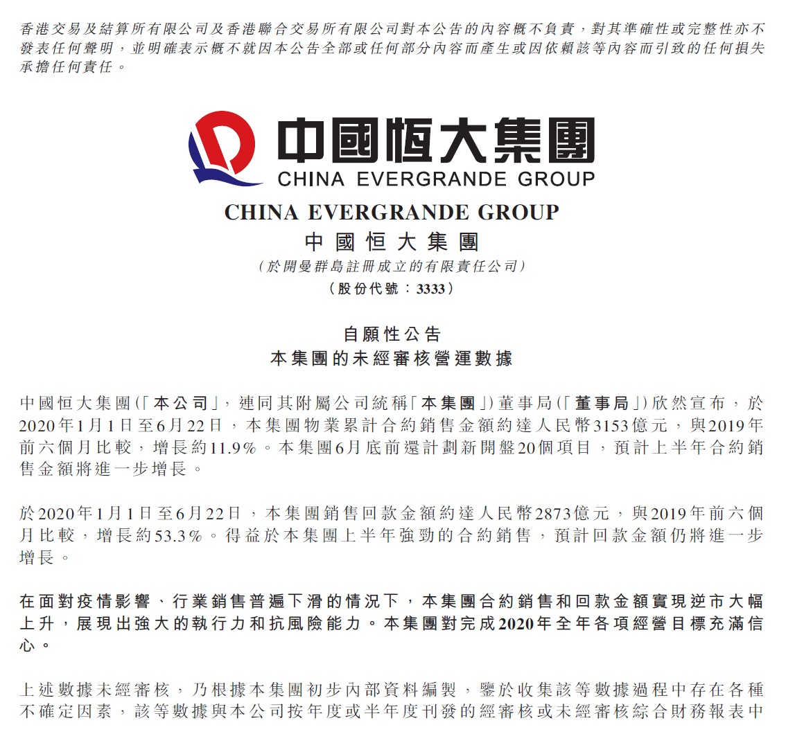 据恒大6月24日的最新业绩数据显示,截至6月22日,恒大已累计实现合约销售额约3153亿,同比增长11.9%,销售回款达2873亿,同比大增53.3%。
