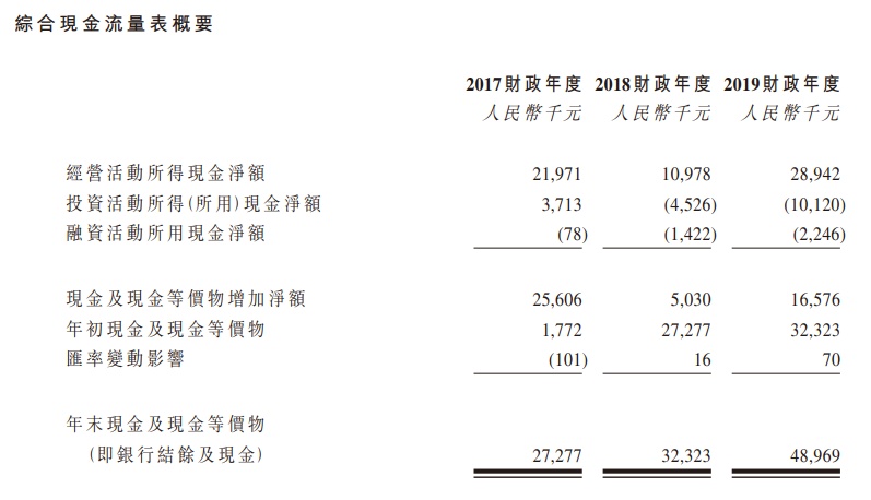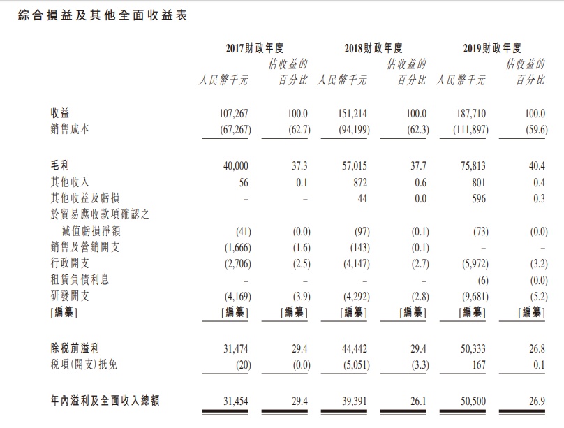 据招股书披露,该公司收益由2017财政年度的人民币1.073亿元增加至2018财政年度的人民币1.512亿元,且2019财政年度进一步增加至人民币1.877亿元,复合年增长率为32.3%。该公司于2017财政年度、2018财政年度及2019财政年度的溢利分别为人民币0.315亿元、人民币0.394亿元及人民币0.505亿元,复合年增长率为26.6%。