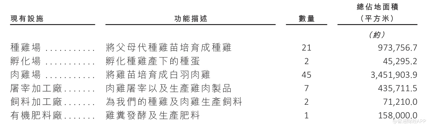 公司自身拥有白羽肉鸡生产设施,位于中国山东。每年可饲养约113百万只肉鸡;屠宰约120百万只肉鸡;及加工约230,000吨鸡肉。于最后可行日期,公司生产团队由6,923名雇员组成。