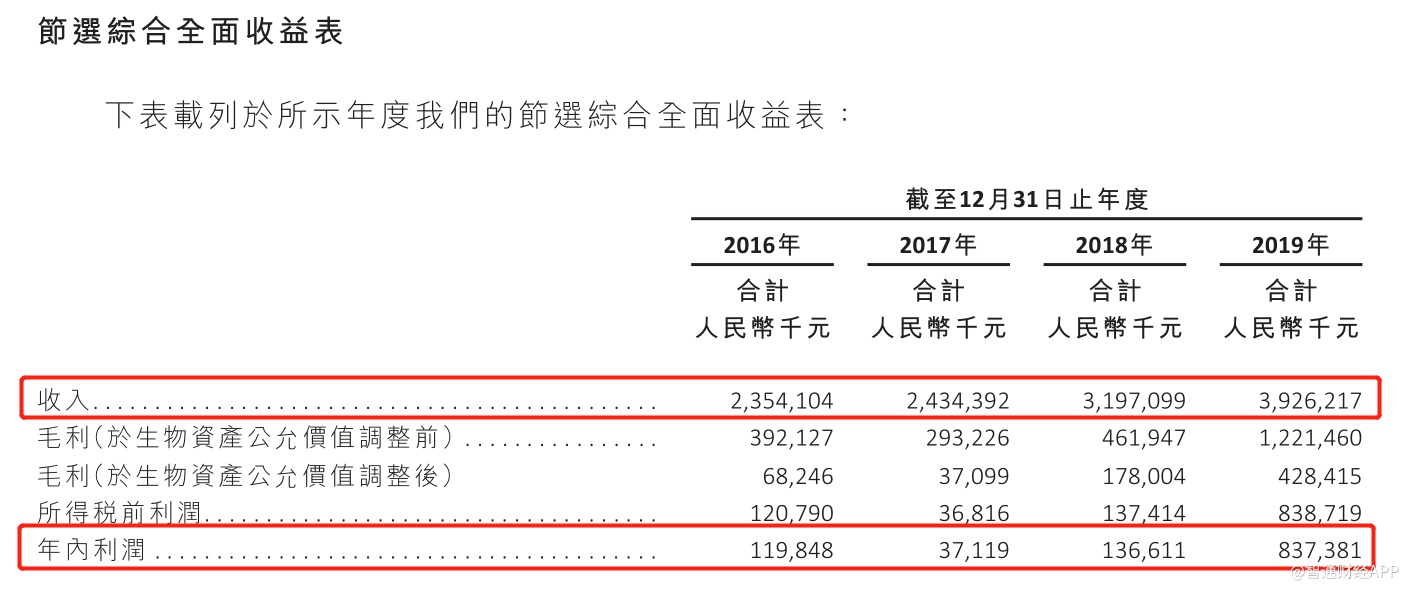 招股书显示,2016年-2019年,公司的收入分别约为人民币23.54亿元、24.34亿元、31.97亿元及39.26亿元。2016年-2019年集团的净利润分别为1.20亿元、3711.9万元、1.37亿元,8.37亿元。2019年净利润同比增长511%,主要是由于2019年鸡肉制品及鸡苗的市价上涨,部分是由于该期间原材料(如豆粕)的平均采购成本下降。