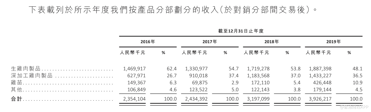 上述期内,公司生鸡肉制品贡献的收入分别约占总收入的62.4%、54.7%、53.8%及48.1%,而深加工鸡肉制品贡献的收入分别约占总收入的26.7%、37.4%、37.0%及36.5%。