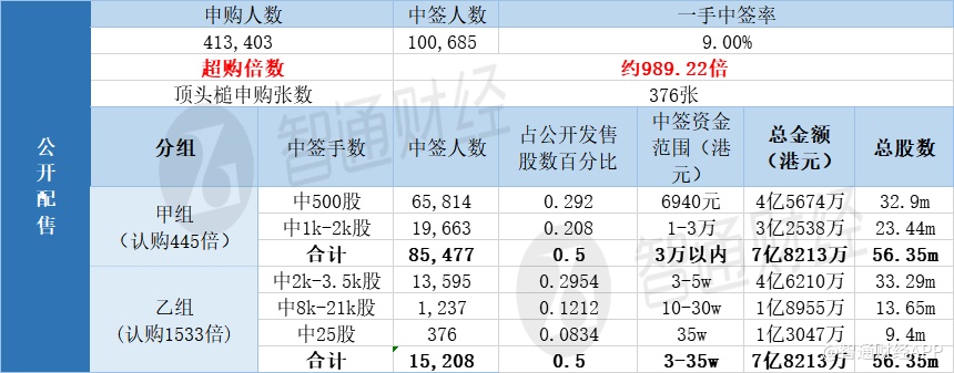 其中,公开配售申购人数413403,一手中签率9.00%,超购倍数989.22倍。