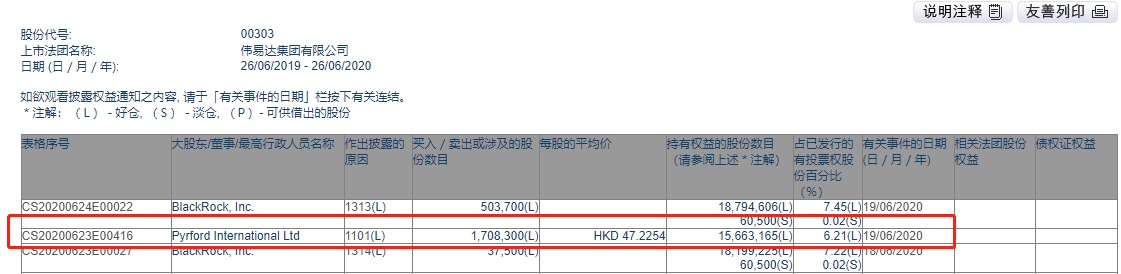 智通财经APP获悉,香港联交所最新资料显示,6月19日,Pyrford International Ltd增持伟易达(00303)170.83万股,每股作价 47.2254港元,总金额约为8067.52万港元。增持后最新持股数目约为1566.32万股,最新持股比例为6.21%。