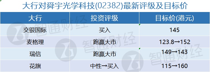 一、各大行对舜宇光学科技(02382)最新投资评级及目标价