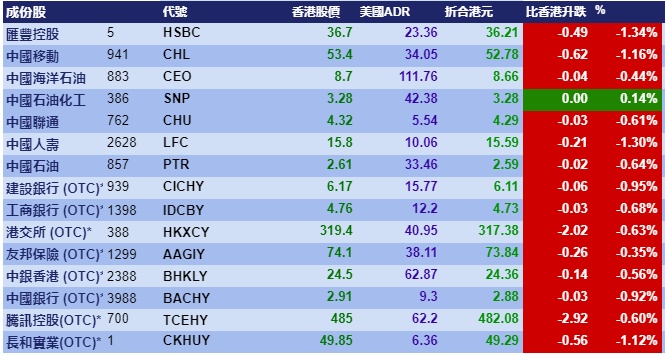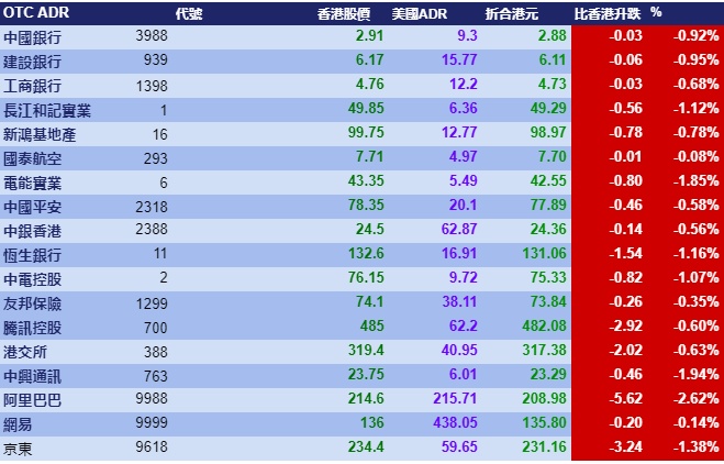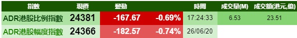 智通财经APP获悉,周五美股大幅下挫,拖累港股ADR指数全日受压,按比例计算,收报24381点,跌167.67点或0.69%。