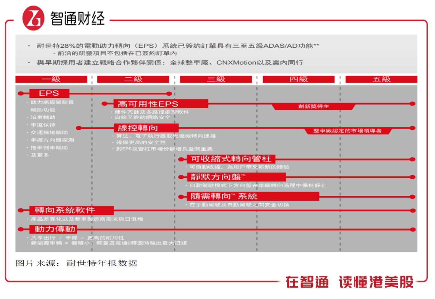 相比于中汽系统,耐世特的业务布局更具有前瞻性,该公司顺应智能化及新能源化的汽车发展方向,积极布局自动化驾驶的前瞻技术。自动驾驶技术分为五级,三级以上就可实现较为高级的自动化水平,目前生产的汽车产品普遍在二级,但该公司已有供应三级至五级的助力转向系统产品。