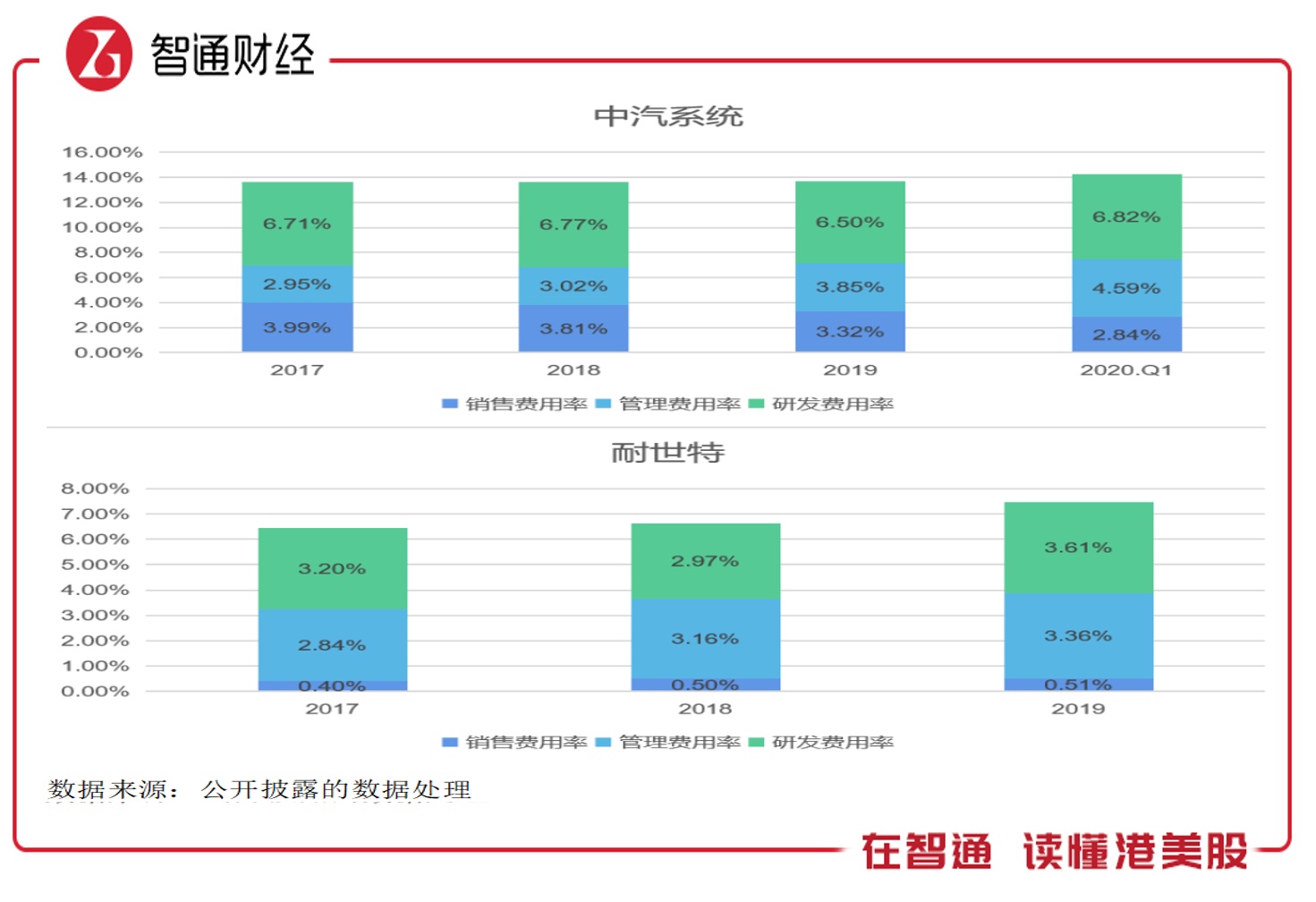 当然,中汽系统的收入规模仅为耐世特的12%,且耐世特市场地区分布较为广泛,由于地区成本差异,直接对比会有误差,在上市的国内同行中,浙江世宝于2019年收入规模为中汽的32.2%,核心收入也为国内。这几年,浙江世宝业绩增长也基本停滞,2020年Q1,其销售、研发及管理费用率分别为6.46%、7.16%和7.05%。